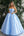 Vestido de bola de organza con volantes en azul cielo con hombros cruzados
