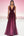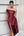 Vestido de gala de satén burdeos con hombros descubiertos y abertura