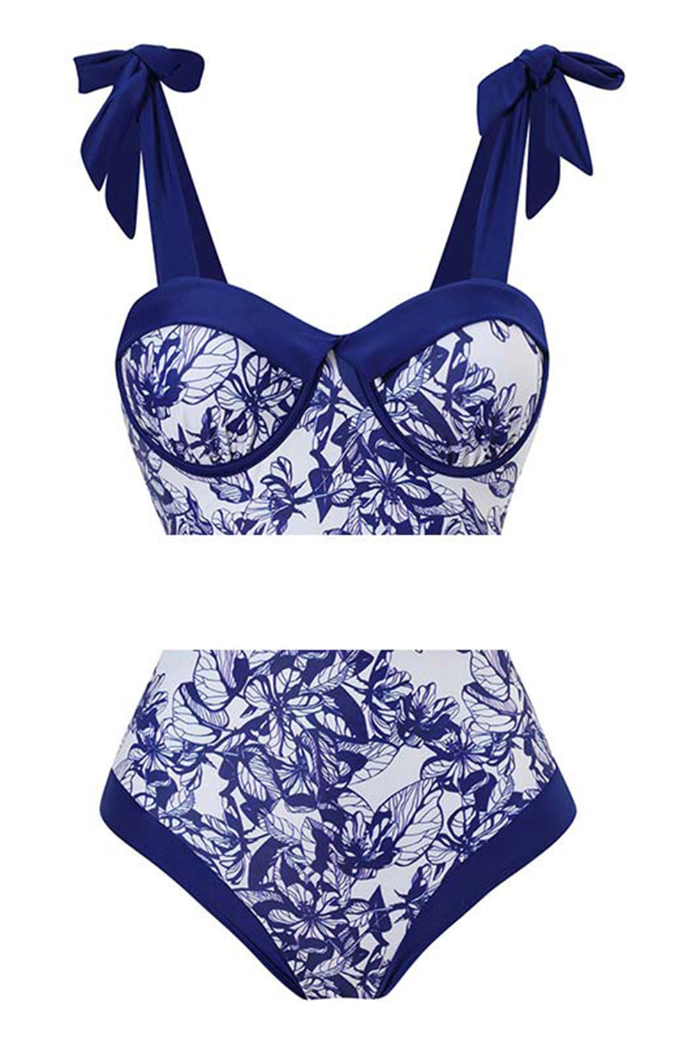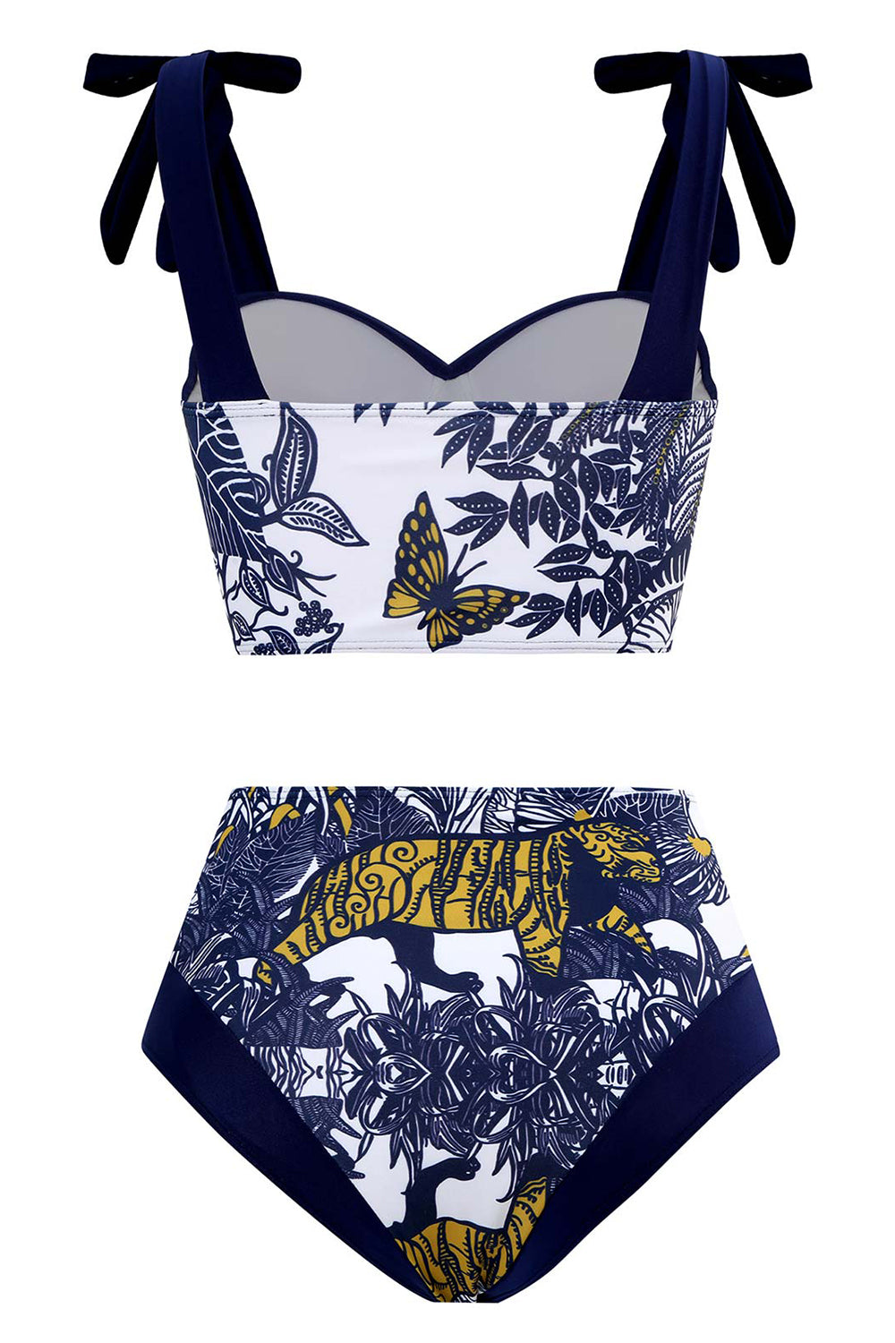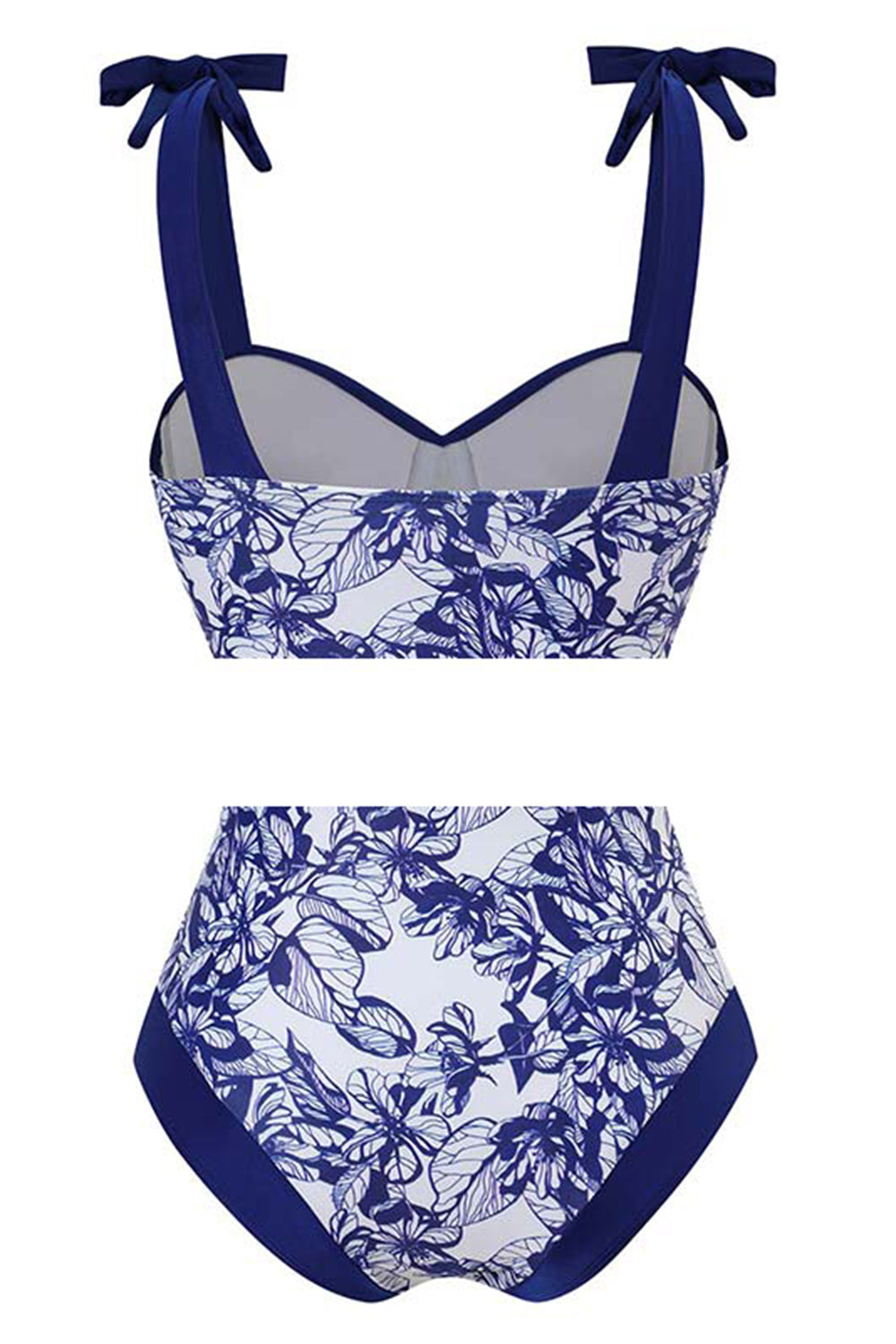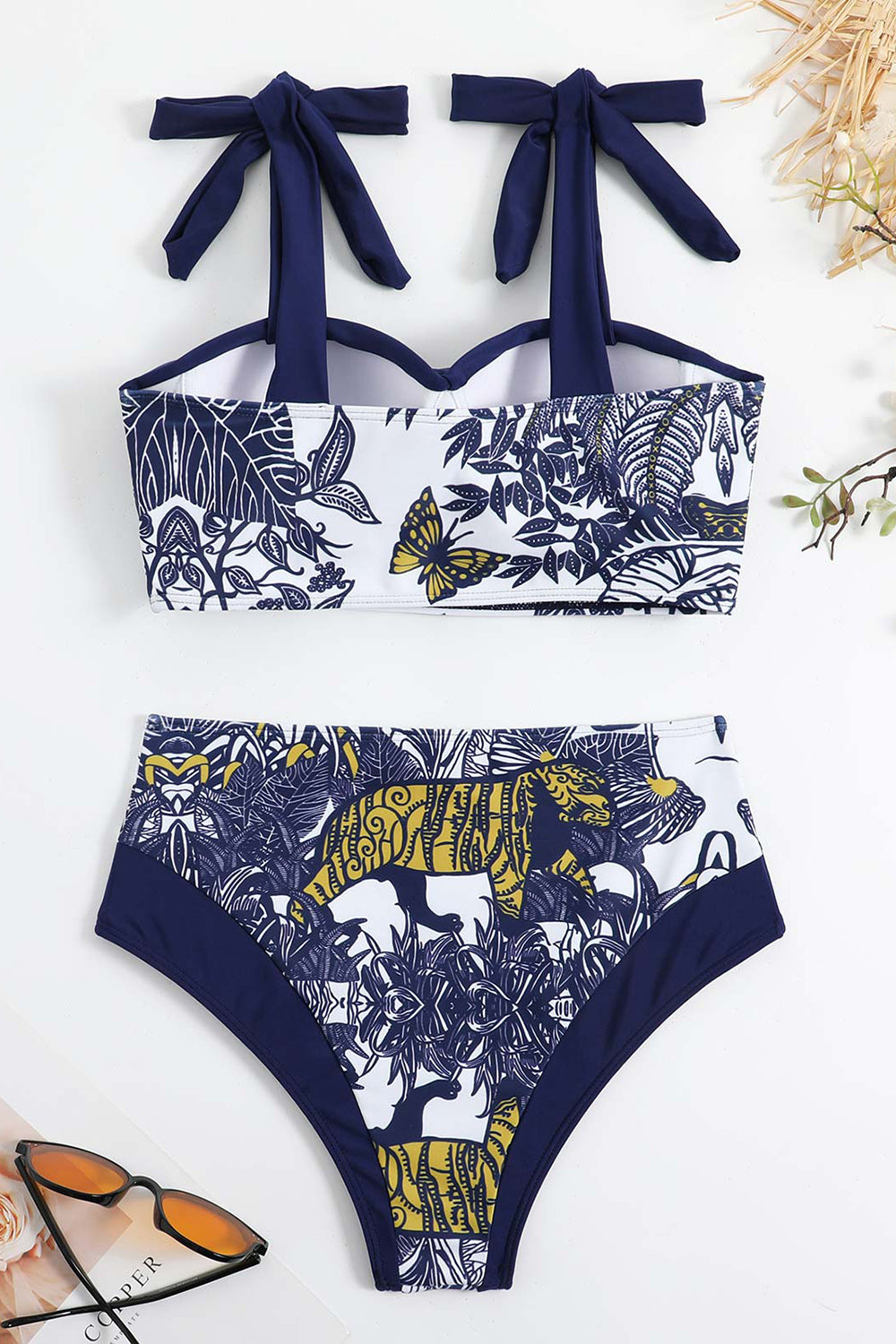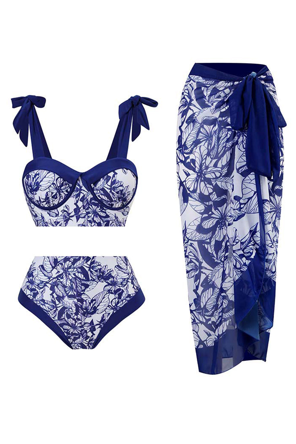 Estampado de cintura alta azul oscuro 3 piezas conjunto de trajes de baño con vestido de playa
