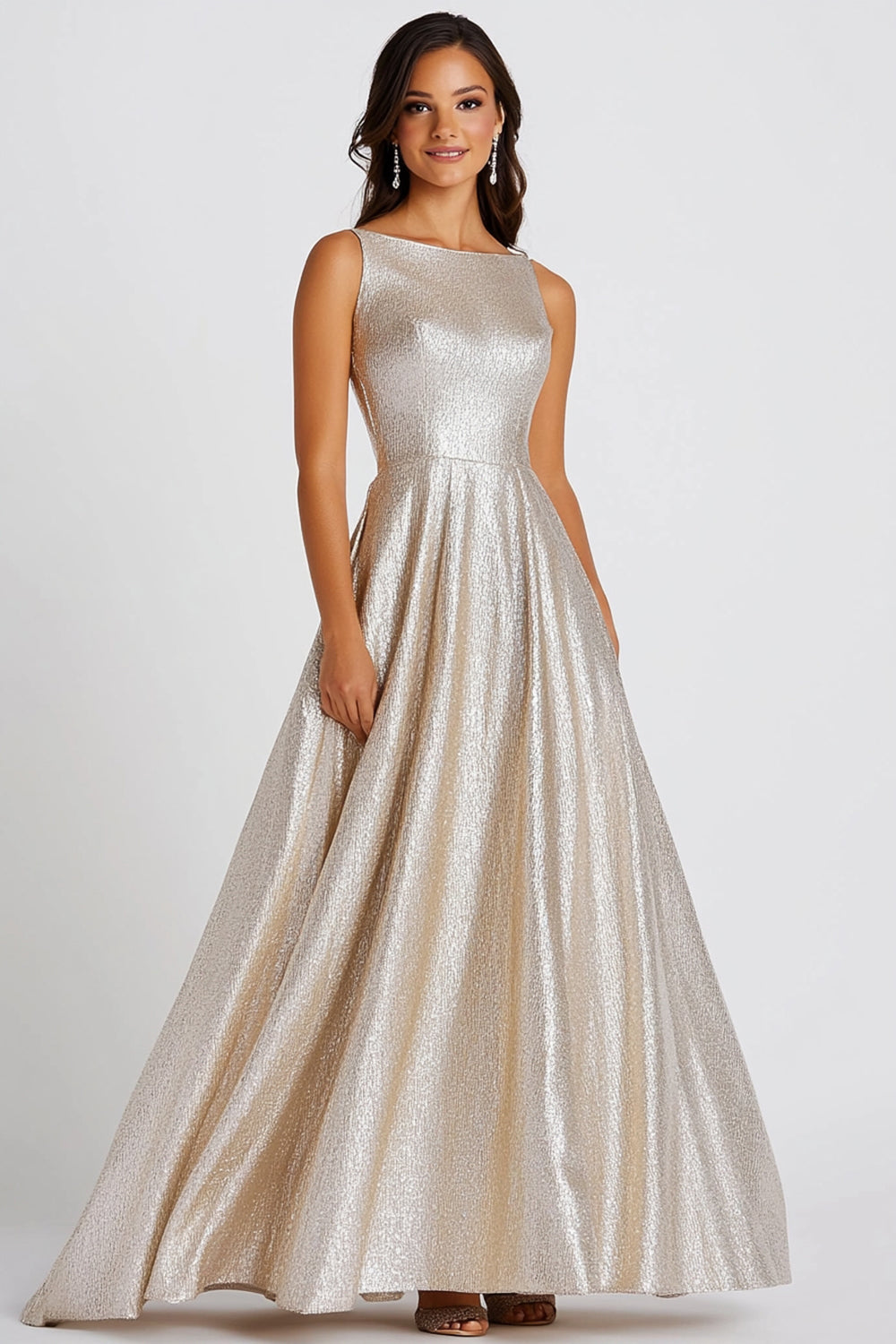 Glitter Champagne Cuello Barco Una Línea Vestido Formal Largo