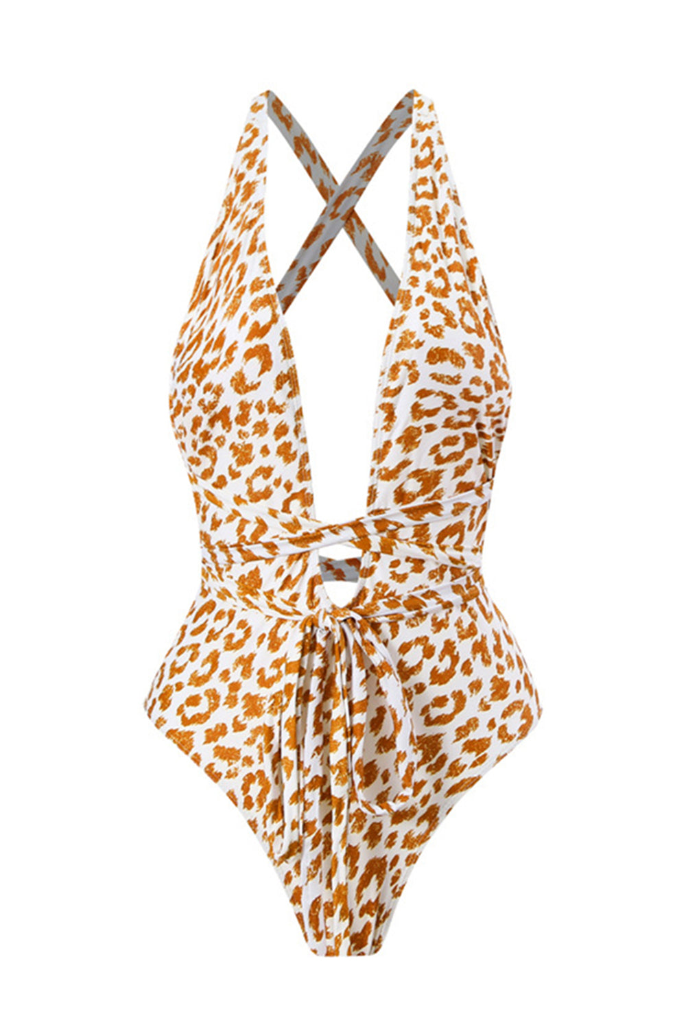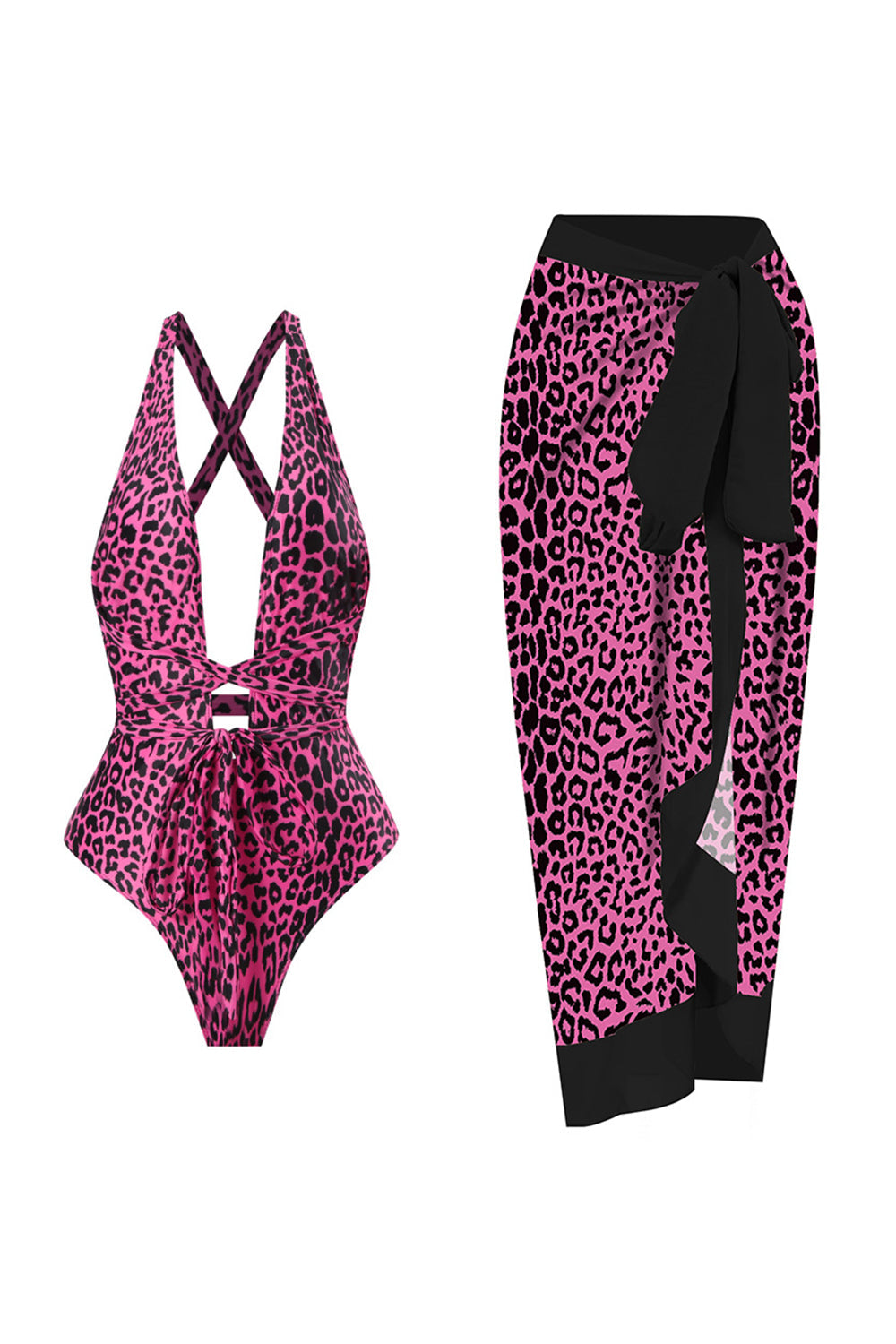 Set de bikini marrón con estampado de leopardo de una pieza con falda de playa