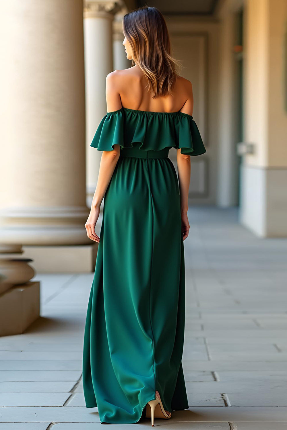 Verde oscuro con hombros descubiertos Vestido formal largo de línea A