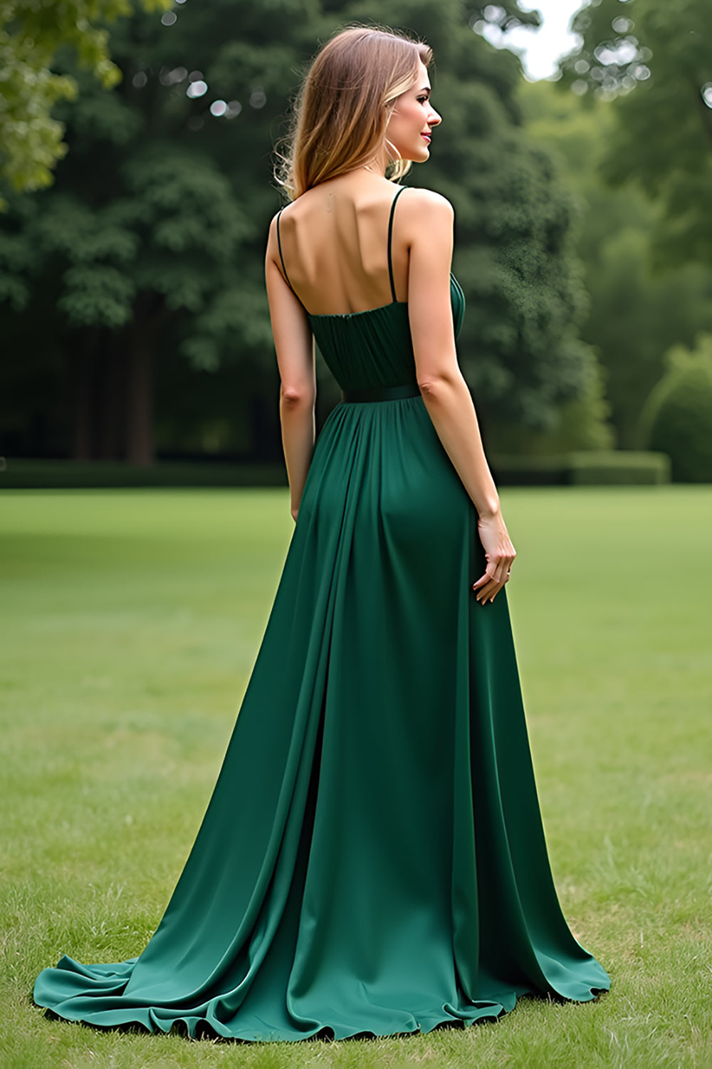 Vestido formal largo de gasa con tirantes finos de línea A verde oscuro