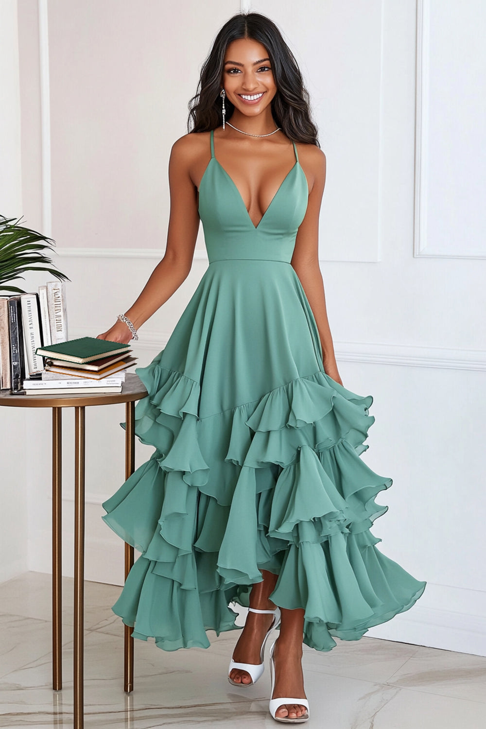 Vestido formal largo de tirantes de gasa verde A Line con volantes