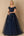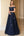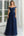 Elegante vestido largo de tul azul marino con hombros descubiertos y apliques de encaje