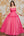 Vestido de fiesta largo de tul escalonado de cuello frío con hombros fríos de color rosa intenso con apliques