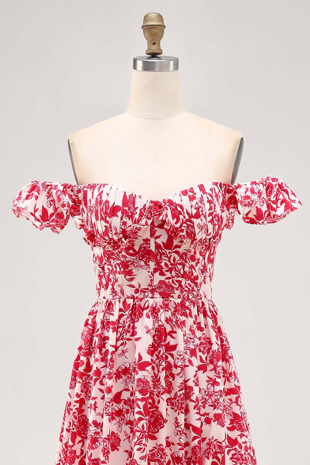 Vestido de invitada de boda azul con volantes estampado con hombros descubiertos y abertura