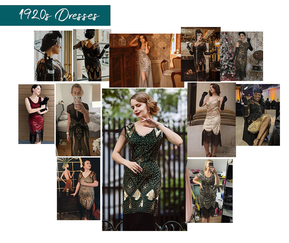 Este vestido clásico de la década de 1920 pertenece a nuestra colección de vestidos de la década de 1920. Tiene un estilo flapper muy clásico, lo que lo convierte en el vestido de la década de 1920 más vendido en nuestro sitio. Con un cuello redondo abierto, un estilo corto y un dobladillo con flecos, este vestido de lentejuelas de los años 20 tiene todos los elementos clásicos. Perfecto para ocasiones como fiestas temáticas de los años 20 y otras fiestas de inspiración vintage.