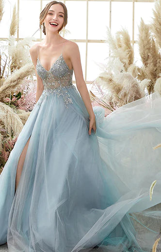 Este vestido azul claro es de nuestra colección de vestidos de noche formales. Es uno de nuestros vestidos más vendidos desde hace un año. Este vestido puso en uso la tela muy fina, se ve aún más hermoso en persona. Con un profundo escote en pico y una silueta de línea A, este vestido está hecho con un tul muy suave que es súper cómodo para la piel.
