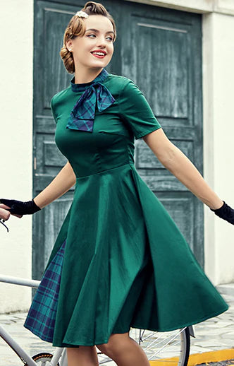 Este vestido verde a cuadros es de nuestra colección de vestidos de los años 50. Es uno de los vestidos más vendidos de la colección. Con un corpiño ajustado de cuello alto y una falda acampanada, este vestido tiene un fuerte estilo vintage de los años 50. Perfecto para los amantes del estilo vintage para usar como ropa de diario o para sesiones de fotos de temas especiales.