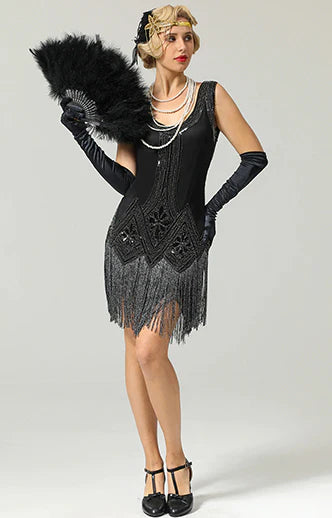 Vestido estilo flapper con lentejuelas negro de los años 20