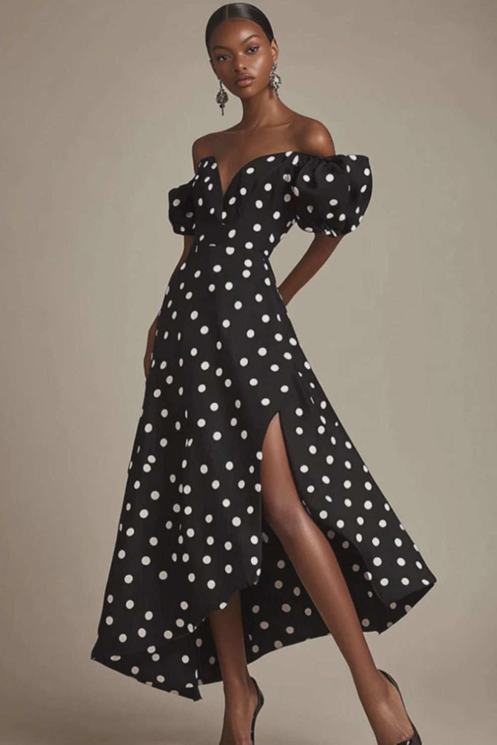 Vestido negro A Line Off The Shoulder Vestido blanco de lunares con abertura